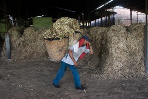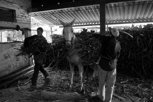 Inicia el proceso el “prensero” quien mete la caña al molino mientras que el “bojotero” recoge el bagazo y lo amarra para pasarlo al sitio correspondiente.