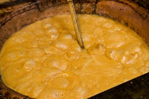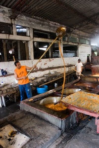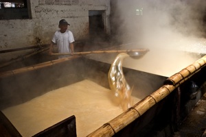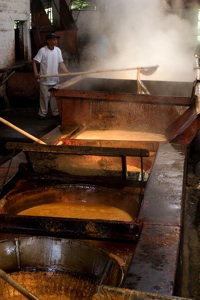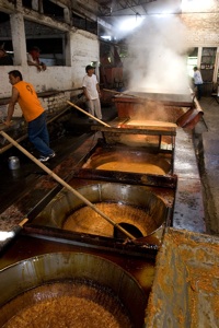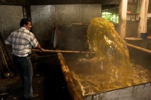 En este momento el “pailero” le agrega la cal, necesaria para blanquear el líquido. Una vez la miel está clara se pasa a la segunda paila donde irá mermando por ebullición, continúa por gravedad, a una tercera paila donde mantiene su cocción para terminar de cuajarse.