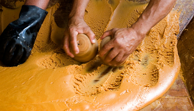 La miel se debe batir con herramientas de madera, hasta que da un punto exacto para luego llevarla a los moldes. Aquí interviene el “corinche” o el que ayuda a preparar la mesa, a limpiar los moldes o gaveras, a distribuir la masa caliente de jugo concentrado o temple a la batea y de ahí a las gaveras.