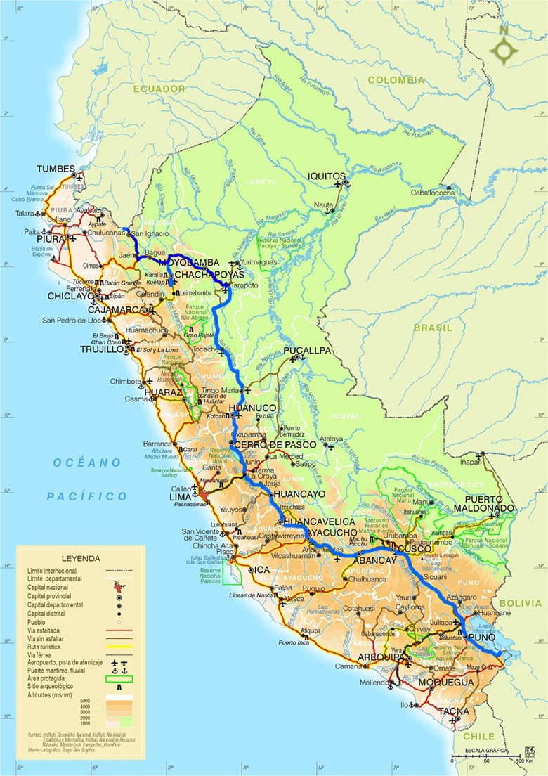 Tarapoto - Tingo María - Huánuco - Cerro de Pasco - Huayre - La Oroya - Huancayo - Huancavelica - Ayacucho - Chumbes - Uripa - Andahuaylas - Abancay - Cusco - Puno - Frontera Bolivia.
