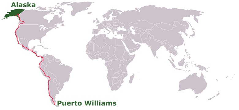 San Pedro de Atacama - Calama - Sierra Gorda - Baquedano - Antofagasta - Paposo - Taltal - Caleta Las Guaneras - Cifuncho - P.N. Pan de Azucar - Chañaral - Caleta Torres del Inca - Caldera - Bahía Inglesa - Puerto Viejo - Bahía Salada - P.N. Llanos de Challe - Huasco - Freirina - Vallenar - Domeyko - Carrizalillo - Punta Choros - La Serena - Coquimbo - Huentelauquen - Los Vilos - Quilimarí - Guangualí - Papudo - Zapallar - Puchuncavi - Nogales - La Calera - Villa Alemana - Viña del Mar - Valparaiso - Olmué - Til Til - Lampa - Santiago - San Bernardo - Alto Jahuel - Rancagua - San Fernando - Romeral - Curico - Rauco - La Huerta - Chanquihue - Constitución - Chanco - Curanipe - Cobquecura - Treguaco - Concepción - Chiguayante - Hualqui - Rere - Yumbel - La Aguada - Los Ángeles - Angol - Traiguen - Galvarino - Padre las Casas - Cunco - Villarrica - Coñaripe - Liquiñe - (Paso fronterizo Carirriñe “Chile - Argentina”) - Parque nacional Lanin - San Martín de los Andes - Ruta de los siete lagos - Villa la Angostura - Dina Huapi - San Carlos de Bariloche - El Bolsón - Parque Nacional Los Alerces - (Paso fronterizo Futaleufú “Argentina - Chile”) - Futaleufú - Puerto Ramirez - La Junta - Puyuhuapi - Villa Mañihuales - Coyhaique - Cerro Castillo - Pto. Ingeniero Ibáñez - Chile Chico - Mallín Grande - Pto. Guadal - Pto. Bertrand - Cochrane - Caleta Tortel - Pto. Yungay - Río Bravo - Villa O’Higgins - Lago O’Higgins - Candelario Mancilla - (Paso fronterizo Dos Lagunas, Chile - Argentina) - Lago del Desierto - Chaltén - Calafate - El Cerrito - (Paso fronterizo Argentina - Chile) - Cerro Castillo - Puerto Natales - Villa Renoval - Villa Tehuelches - Punta Arenas - (Barco a través del Estrecho de Magallanes - Isla Grande de Tierra del Fuego) - Porvenir - (Paso fronterizo San Sebastián, Chile - Argentina) - Río Grande - Tolhuin - Ushuaia - Puerto Williams (...)