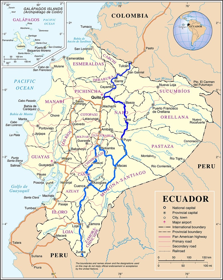 Tulcán - Ibarra - Cayambe - Tumbaco - Quito - Baeza - Tena - Puyo - (“Marc”, Macas - Méndez - Cuenca) - (“Indira y Thomas”, Macas - Riobamba - Alausi - Cuenca) - San Felipe de Oña - Saraguro - Loja - Vilcabamba - Yangana - Valladolid - Palanda - Zumba.