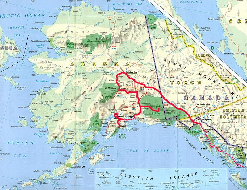 Pasaré un mes y medio recorriendo este insólito país, plagado de anécdotas e historias fantásticas. Mi pedalear me llevará a conocer lugares como Seward, Valdez, Whittier, Chitina, Kennecott, McCarthy, Nenana, Fairbanks y otros tantos no menos singulares.