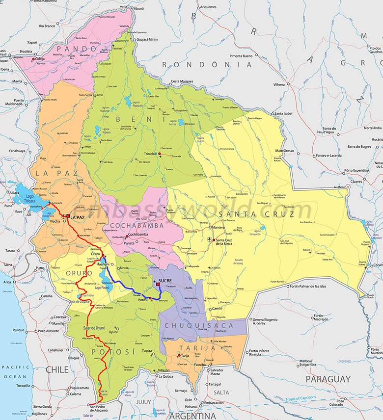 Copacabana - La Paz - Oruro - (*Potosí, Sucre) - Oruro - Toledo - Ancaravi - Huachacalla - Chipaya - Vinto - Villa Vitalina - Coipasa - Salar Coipasa - Tauca - Luca - Salinas de Garci Mendoza - Jirira - Salar de Uyuni - (Isla Lomo de Pescado - Isla Inca Huasi) - Río Grande - San Cristóbal - Culpina Ka - Alota - Valle de Rocas - Villa Mar - Campamento Minero - Laguna Colorada - Geysers Sol de Mañana - Refugio Polque - Laguna Verde - Laguna Blanca - Refugio Parque Nacional Eduardo Avaroa - Paso fronterizo Portezuelo del Cajón (4480 m.s.n.m.)